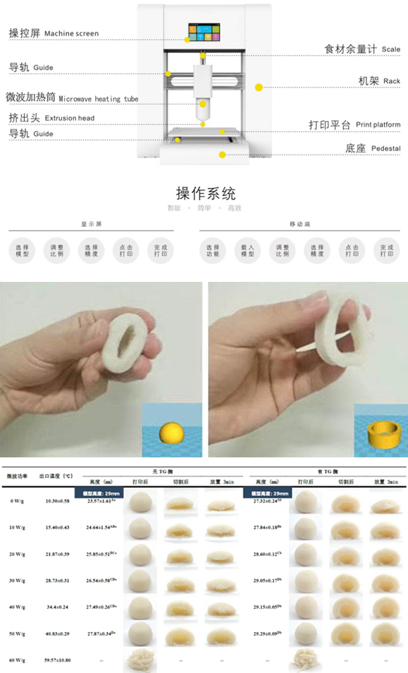 食品微波3D打印機(jī)工作原理及使用特性:1.食品微波3D打印機(jī),就是基于熔融擠出型(FDM)3D打印技術(shù),結(jié)合微波聚焦式加熱系統(tǒng),通過(guò)對(duì)擠出噴嘴內(nèi)快速流動(dòng)的毫米級(jí)物料進(jìn)行集中加熱的形式,實(shí)現(xiàn)3D打印食品即時(shí)固化及熟化的新型食品3D打印技術(shù)。微波食品3D打印機(jī)利用聚焦式微波加熱技術(shù)在極小的空間內(nèi)將正在擠出的物料進(jìn)行快速加熱,通過(guò)功率及物料性質(zhì)的調(diào)整,實(shí)現(xiàn)物料的擠出即時(shí)固化。配合3D模型控制系統(tǒng),通過(guò)X、Y、Z三軸的機(jī)械運(yùn)動(dòng),按照模型生成的路徑通過(guò)馬達(dá)物理式擠出食材,層層做疊加,zui終實(shí)現(xiàn)食品的立體成型。魚(yú)糜、肉糜、蝦糜、植物蛋白濃縮物、面團(tuán)等熱凝膠型物為適用于此微波食品3D打印機(jī)的一類食材。非熱凝膠型流體類食材亦可通過(guò)配料調(diào)整適配此微波食品3D打印機(jī)。先歐微波3D食品打印機(jī)已經(jīng)是一款智能硬件,內(nèi)置有無(wú)線網(wǎng)卡,連接WIFI,可實(shí)現(xiàn)通過(guò)移動(dòng)端的APP來(lái)操作,所有的數(shù)據(jù)都可實(shí)現(xiàn)在云端來(lái)交互。目前軟件可以實(shí)現(xiàn)的功能有A.線上海量數(shù)據(jù)庫(kù)選取一鍵打印;B.手繪打印;C.文字輸入打印;D.拍照打印;E.微波功率實(shí)時(shí)在線調(diào)整。硬件的交互體驗(yàn)做到了零門檻,觸動(dòng)指尖即可一鍵打印,讓創(chuàng)造變成現(xiàn)實(shí)人人唾手可得.